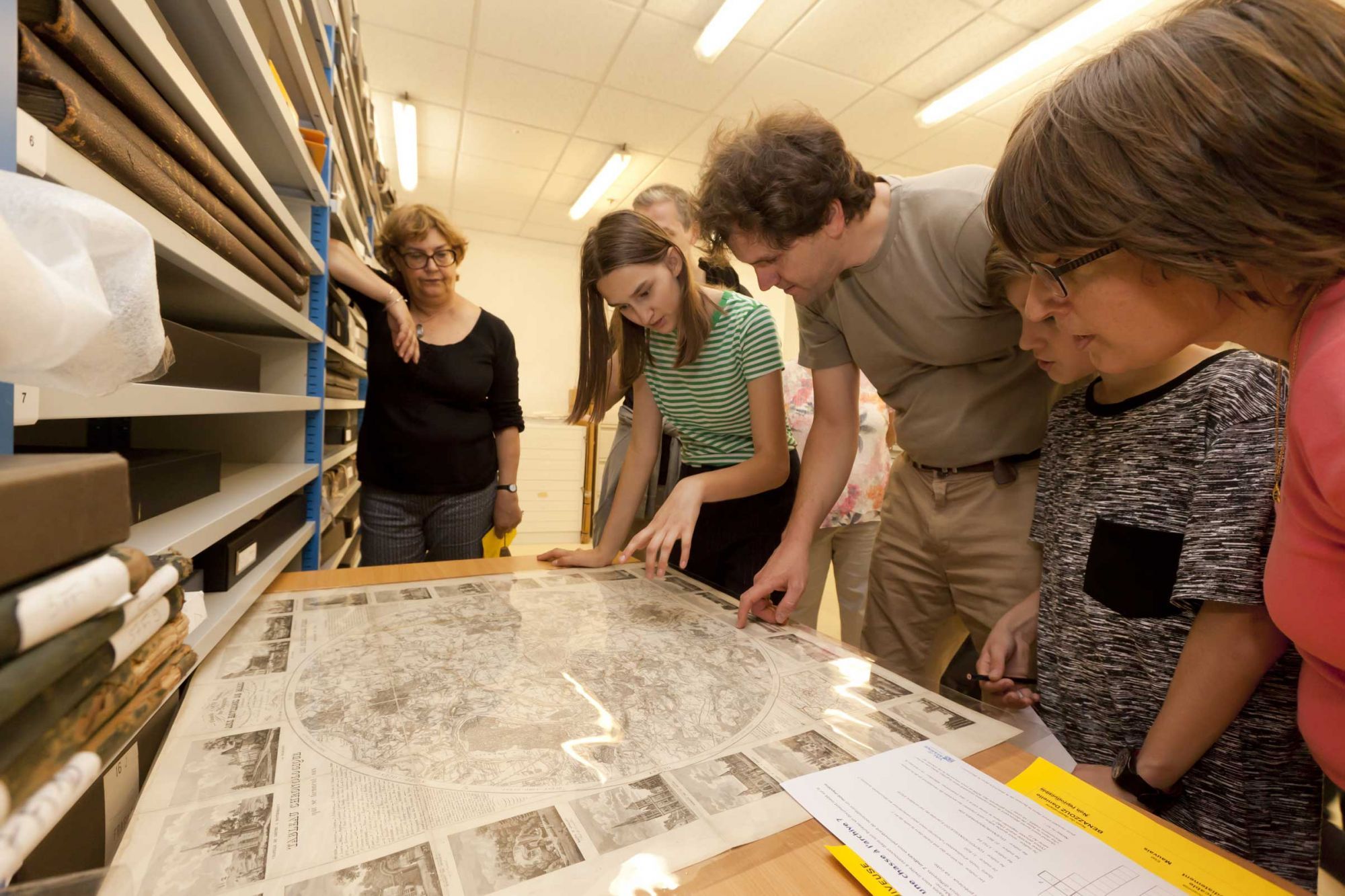 Lors d’une déambulation dans des espaces habituellement réservés aux archivistes, les différents métiers des archives se révèlent à travers le circuit d’un document, de sa réception jusqu’à sa mise à disposition au public.
