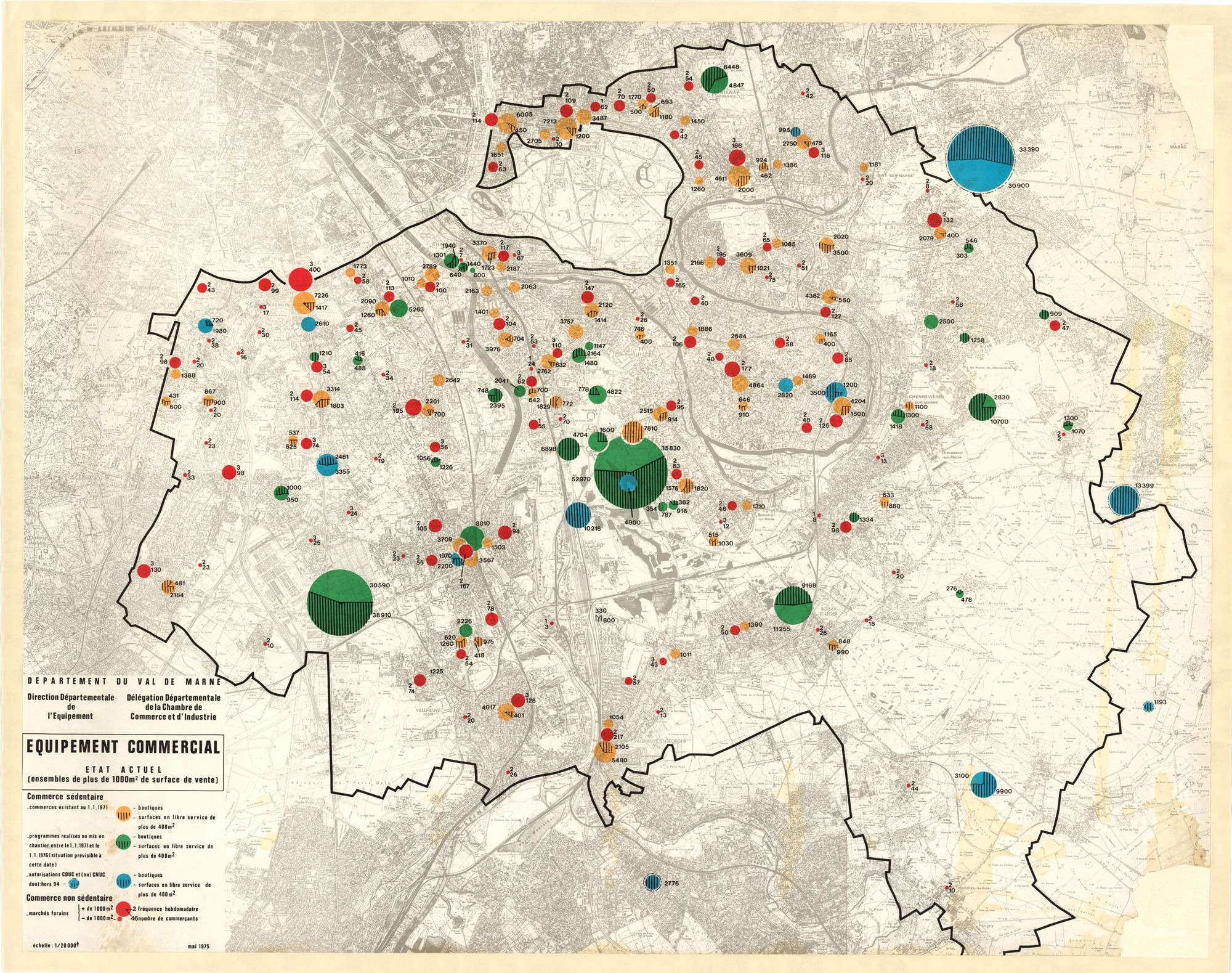 Des « mythes » modernes popularisés par la publicité comme la recherche d’efficience domestique, la liberté ou l’hygiène concourent à diffuser l’électroménager, la voiture individuelle ou les emballages jetables dans la vie quotidienne des individus. Si seulement 7,5 % des ménages possèdent un réfrigérateur en 1954, ils sont 91 % en 1975. La fièvre acheteuse s’empare des Val-de-Marnais à mesure que les centres commerciaux s’imposent dans ses paysages. Leur superficie y double en trois ans atteignant 621 000 m² en 1973. Si bien qu’en 1976 ils représentent 1/3 des surfaces de vente du territoire.