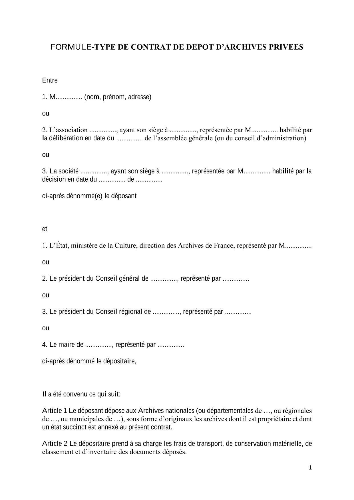 Une convention de dépôt ou de don énumère les conditions dans lesquelles le dépôt est effectué et les documents sont communiqués au public. Il stipule qu'un état succinct des documents doit être opéré par le dépositaire : les opérations de tri et d'évnetuelles éliminations seront effectuées par le service dépositaire du fonds. La lettre type d'intention de don est le modèle des Archives du Val-de-Marne et la convention type de dépôt est la version proposée par le Service interministériel des Archives de France (Siaf).