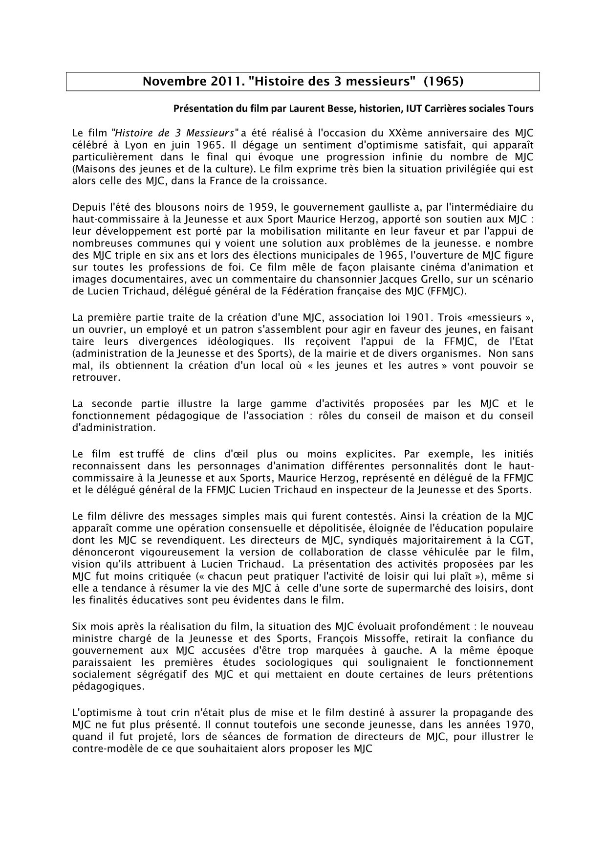 Ce film "Histoire de 3 Messieurs" a été réalisé à l'occasion du XXème anniversaire des MJC célébré à Lyon en juin 1965. Il dégage un sentiment d'optimisme satisfait, qui apparaît particulièrement dans le final qui évoque une progression infinie du nombre de MJC (Maisons des jeunes et de la culture). Le film exprime très bien la situation privilégiée qui est alors celle des MJC, dans la France de la croissance.