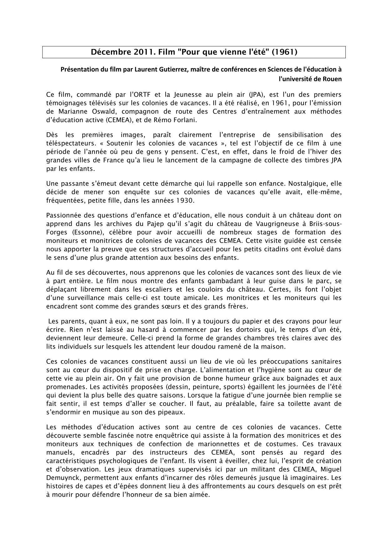 Ce film, commandé par l’ORTF et la JPA, est l’un des premiers témoignages télévisés sur les colonies de vacances. Il a été réalisé, en 1961, pour l’émission de Marianne Oswald, compagnon de route des Centres d’entraînement aux méthodes d’éducation active (CEMEA), et de Rémo Forlani.