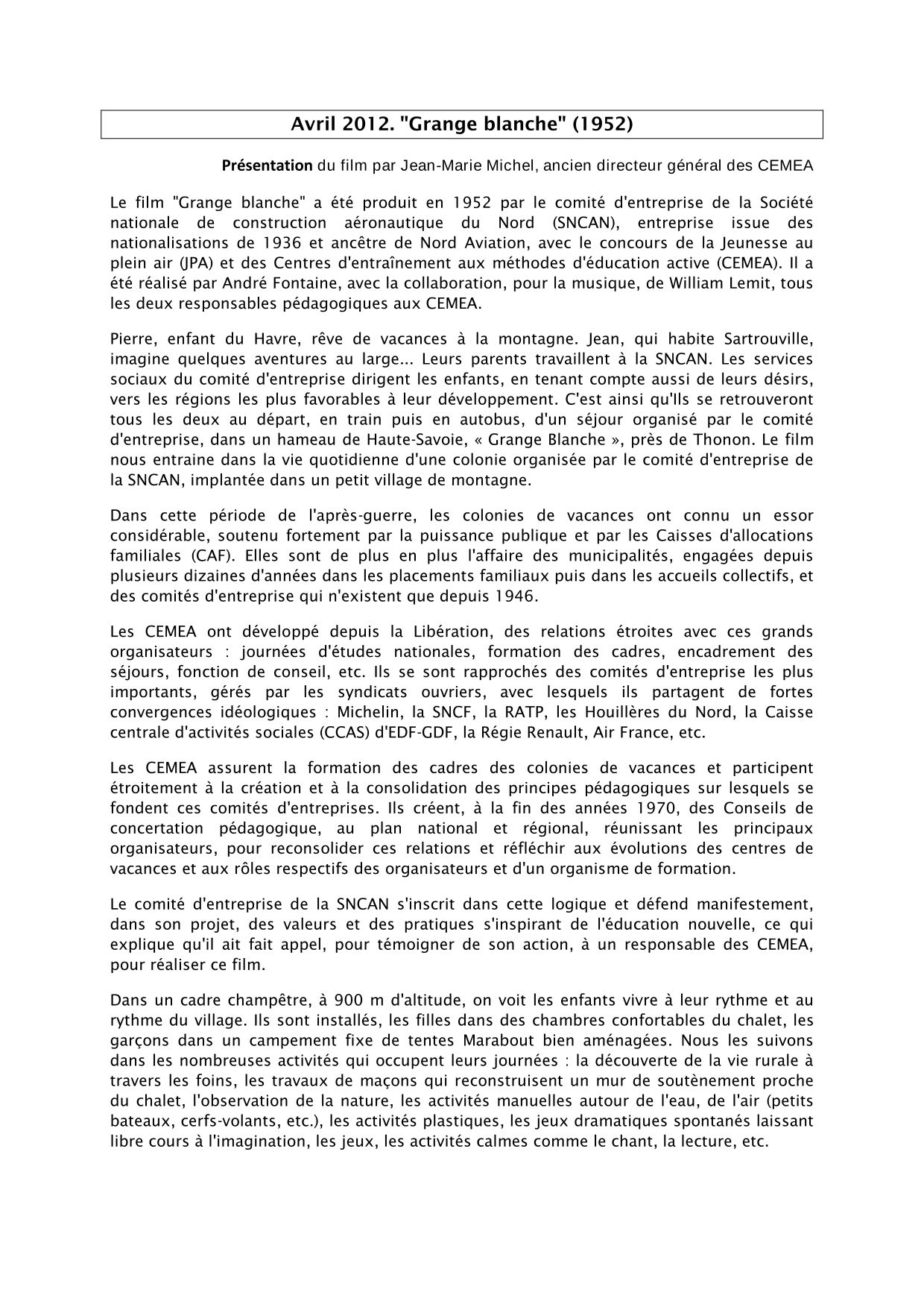 Ce film de 31 minutes décrit le fonctionnement d'une colonie de vacances située dans les Alpes et organisée pour les enfants des travailleurs d'une usine de l'aéronautique. Il montre les relations étroites entre les comités d'entreprise et les mouvements d'éducation populaire, plus particulièrement les CEMEA. Il a été réalisé par André Fontaine, avec la collaboration, pour la musique, de William Lemit, tous les deux responsables pédagogiques aux CEMEA.
