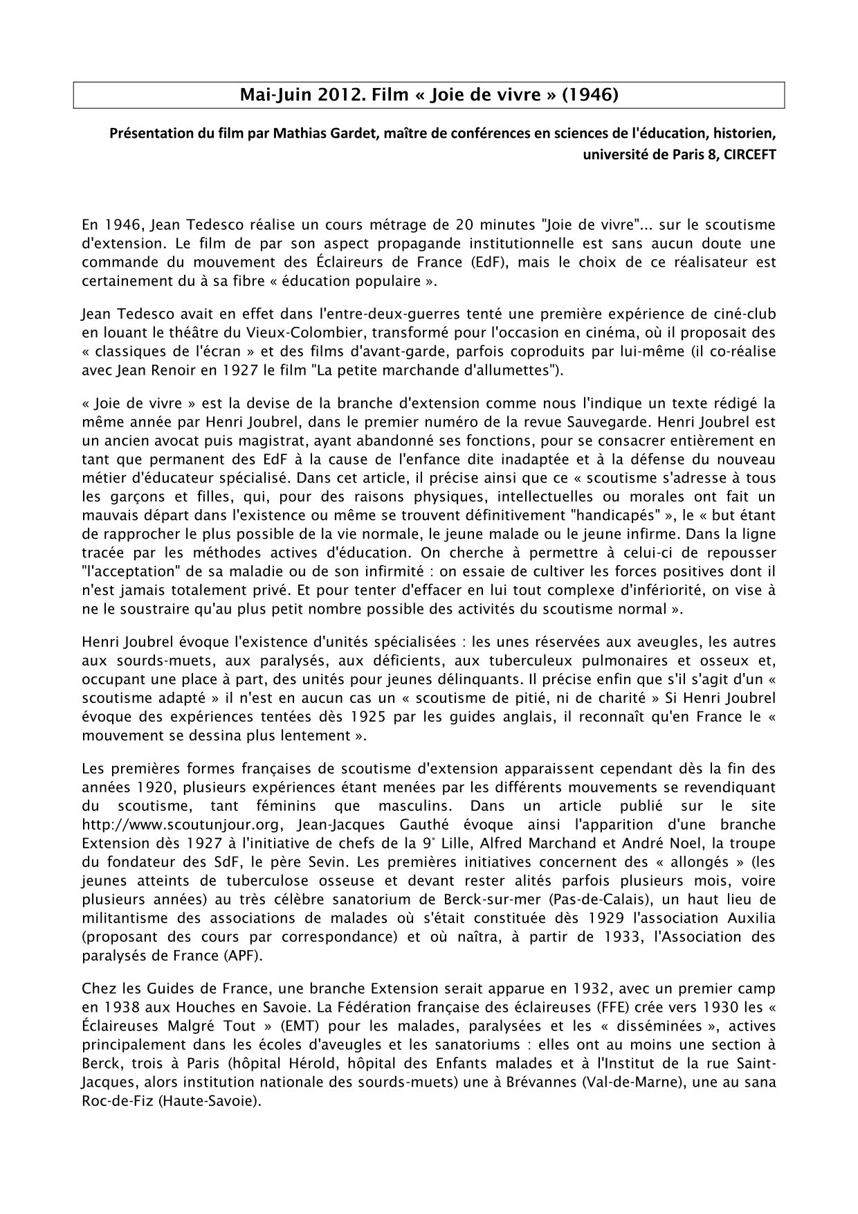 "Joie de vivre" est un court métrage d'environ 20 minutes réalisé par Jean Tedesco sur le scoutisme d'extension. Le film de par son aspect propagande institutionnelle est sans doute une commande du mouvement des Éclaireurs de France (EdF), mais le choix de ce réalisateur est certainement dû à sa fibre « éducation populaire ».