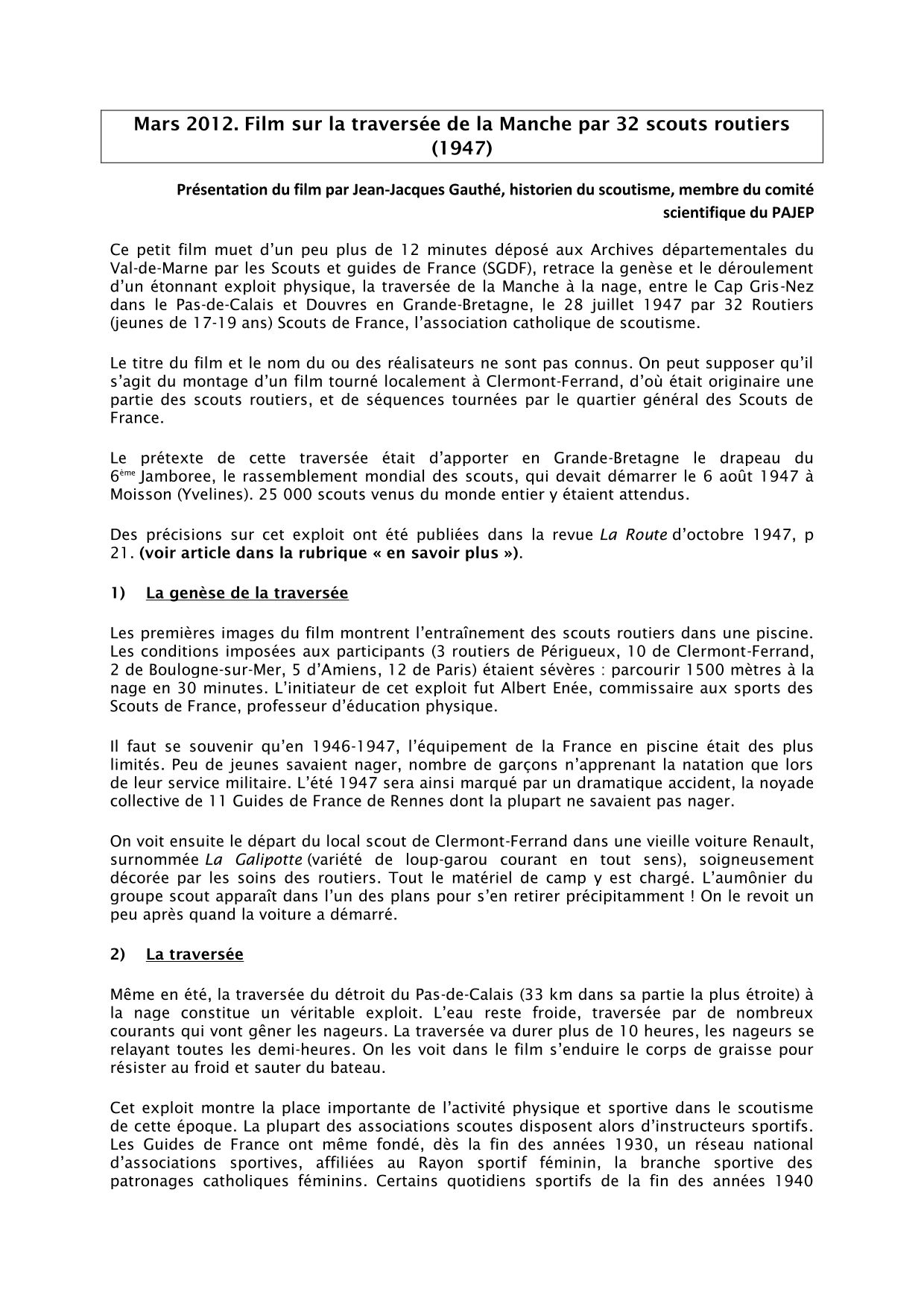 Ce film muet d’un peu plus de 12 minutes retrace la genèse et le déroulement d’un étonnant exploit physique, la traversée de la Manche à la nage, entre le Cap Gris-Nez dans le Pas-de-Calais et Douvres en Grande-Bretagne, le 28 juillet 1947 par 32 Routiers (jeunes de 17-19 ans) Scouts de France, l’association catholique de scoutisme. Le titre du film et le nom du ou des réalisateurs ne sont pas connus. On peut supposer qu’il s’agit du montage d’un film tourné localement à Clermont-Ferrand, d’où était originaire une partie des scouts routiers, et de séquences tournées par le quartier général des Scouts de France.