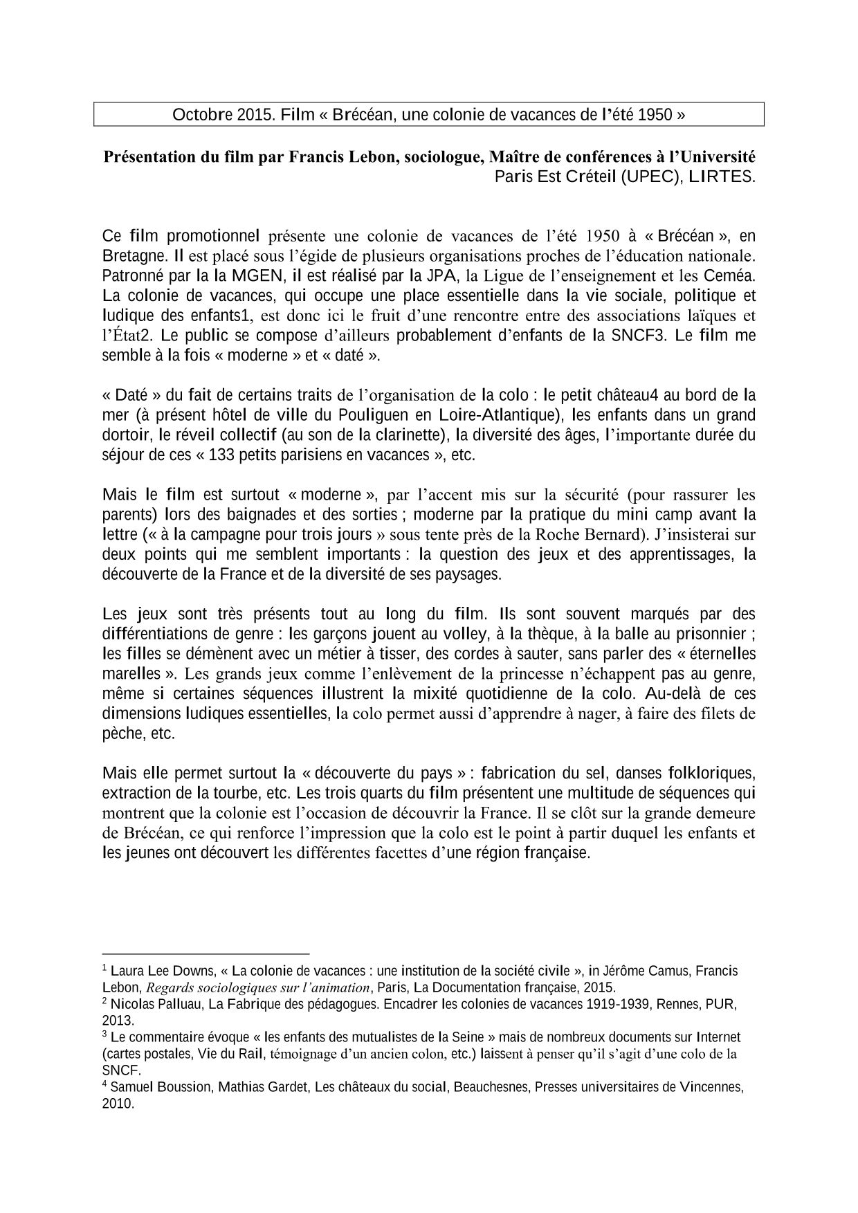 La réalisation de ce film permet de mettre en lumière le centre de Brécéan qui accueille à l'été 1950 une centaine d'enfants parisiens. Les différentes activités des enfants, encadrées par les moniteurs, y sont présentées. Ce film permet aussi de mettre l'accent sur une rencontre entre les associations de jeunesse et d'éducation populaire et l'État.