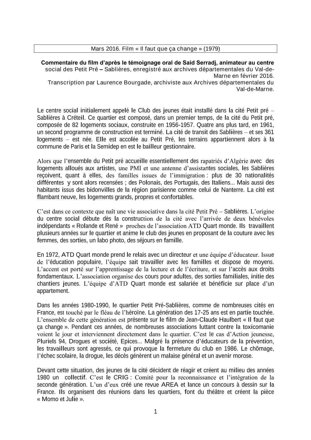 En février 2016, les Archives départementales du Val-de-Marne, en collaboration avec le PAJEP, ont réalisé deux entretiens audio : le premier d’un habitant du Petit Pré – Sablières Jamel Sebouai, le second d’un animateur du Centre social Said Serradj. Laurence Bourgade des Archives départementales du Val-de-Marne a réalisé la retranscription de ce dernier pour réaliser le commentaire de ce film.