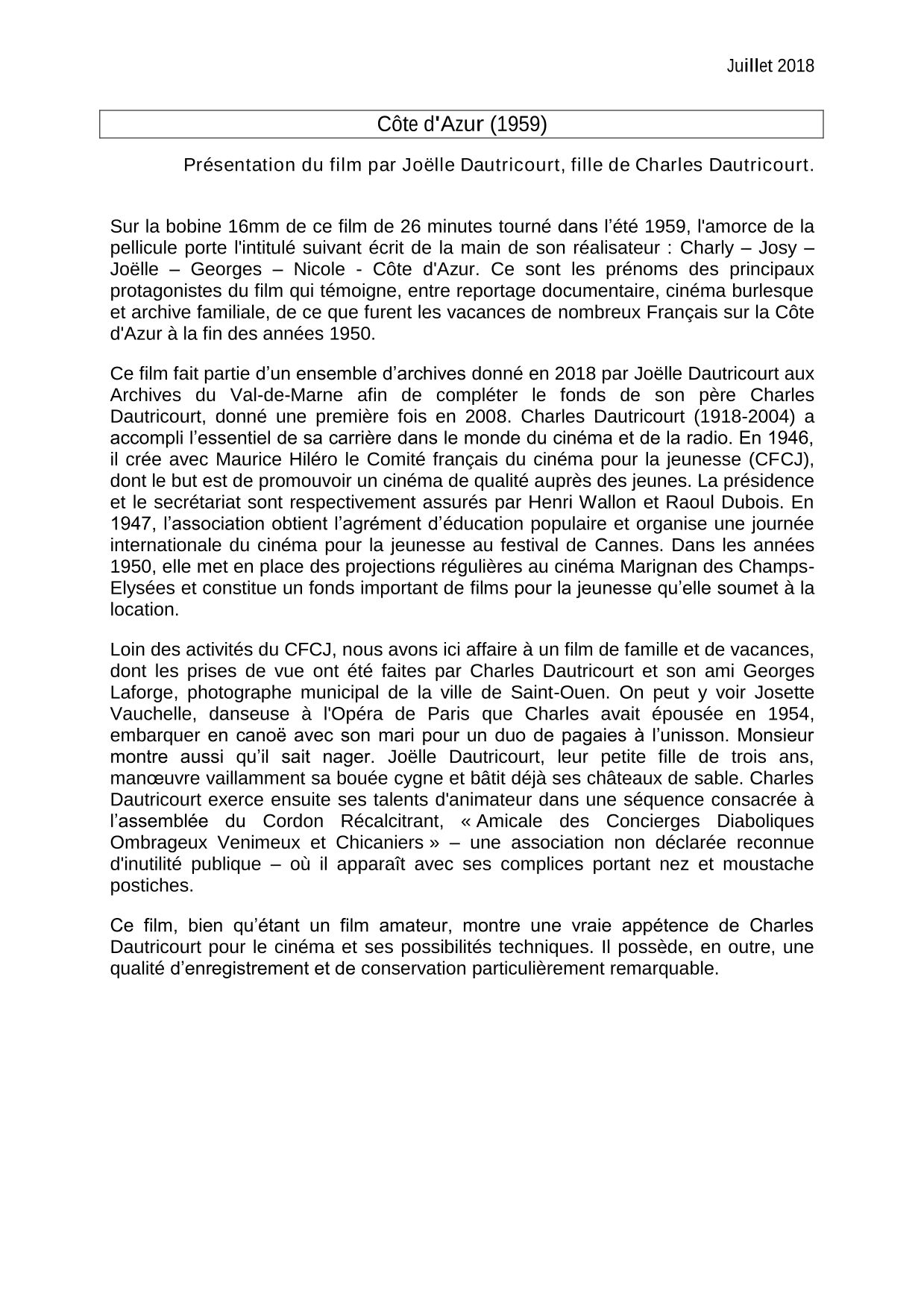 Charles Dautricourt (1918-2004) est un militant d'éducation populaire pionnier dans la diffusion du cinéma auprès de l'enfance et de la jeunesse, co-fondateur en 1947 du Comité français du cinéma pour la jeunesse (CFCJ). Les archives de cette association ayant été perdues dans les années 1980 au moment de sa dissolution, celles des militants Raoul Dubois (1922-2004) et Charles Dautricourt données dans le cadre du PAJEP sont les seuls ensembles susceptibles de contenir des traces des activités menées par le CFJC pendant 40 ans. En 2018, Joëlle Dautricourt, fille de Charles, a effectué un don supplémentaire des archives de son père. Parmi ces archives figurent des documents audiovisuels produits dans un cadre privé. Avec l'accord des héritiers, nous avons choisi, pour célébrer l'été, de diffuser ce film muet et en couleurs réalisé pendant l'été 1959. Il s'agit d'un film de vacances de la famille Dautricourt durant un séjour au Lavandou, près de Saint-Tropez.