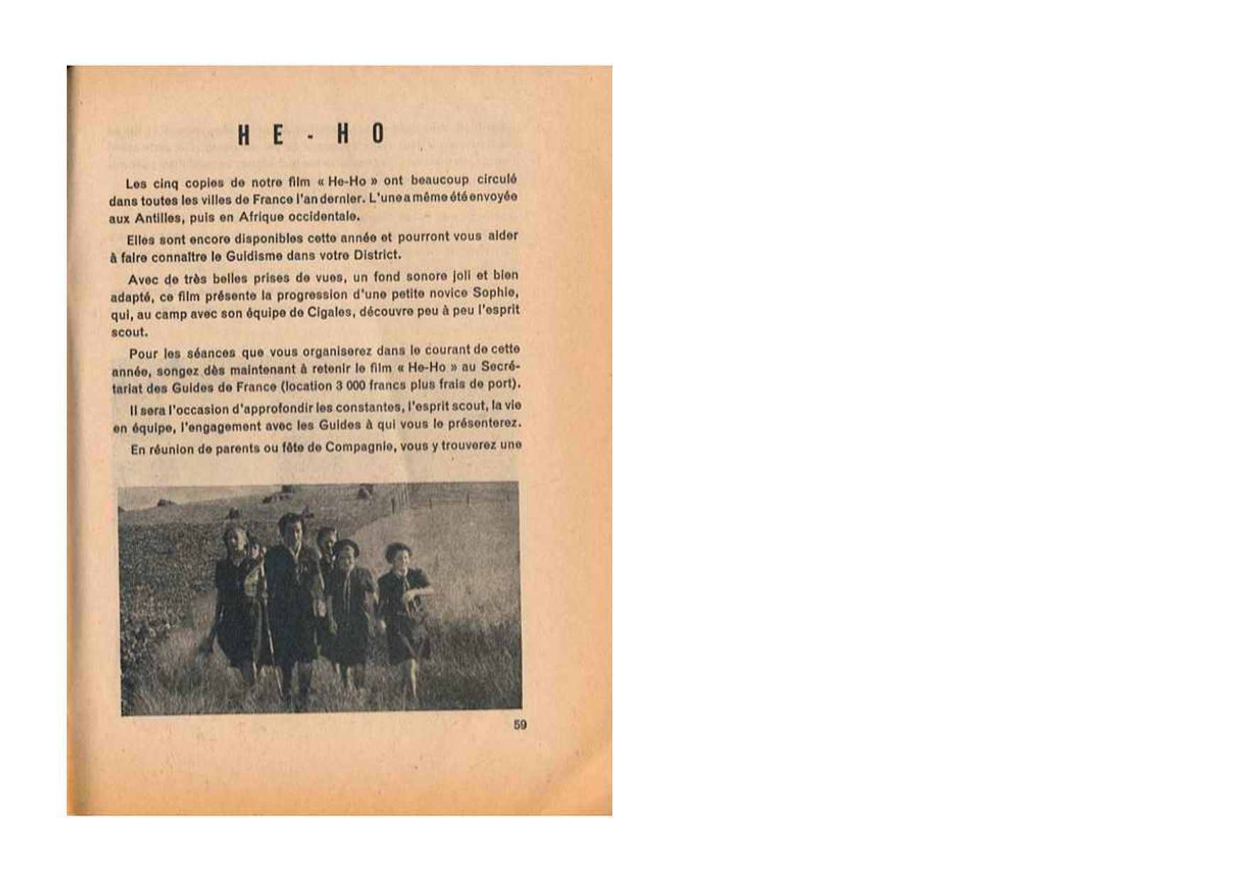 "Hé ! Ho !" est un film 29 minutes tourné durant l’été 1953, produit par Georges Rosetti et réalisé par Guy Jorré pour les Guides de France, mouvement catholique féminin de scoutisme, afin de faire connaître leur association. Celle-ci compte à l’époque 42 000 adhérentes de 8 à 19 ans et constitue l’une des plus importantes associations féminines de France. Il raconte comment Sophie, adolescente de 12 ans, découvre le scoutisme.…