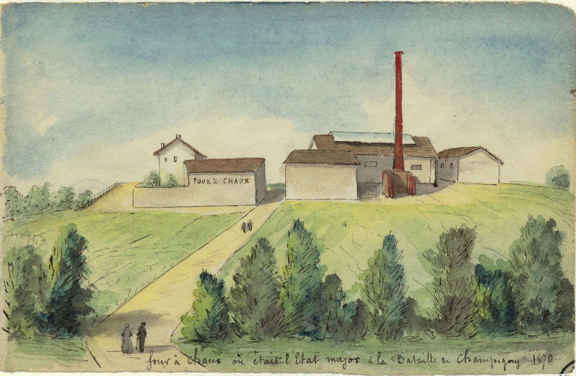 Four à chaux où était l'Etat major à la bataille de Champigny. Aquarelle d'Albert Capaul. [1880]. Archives départementales du Val-de-Marne, 9FI Champigny 7.