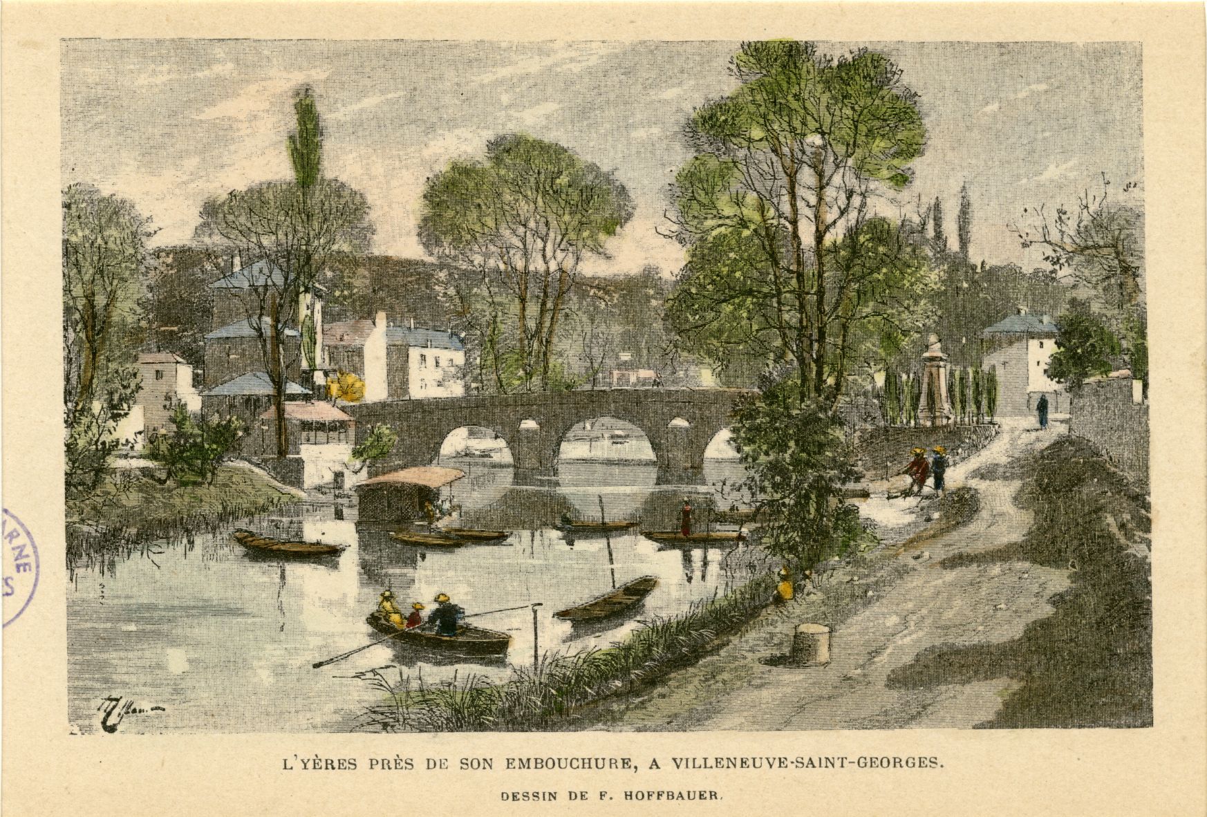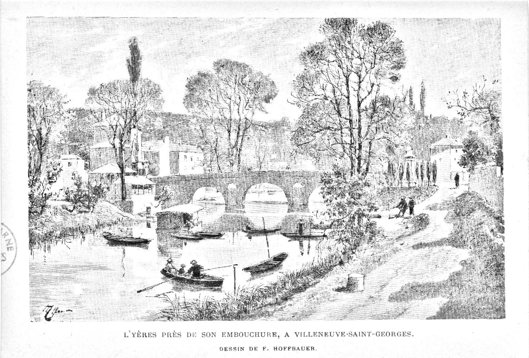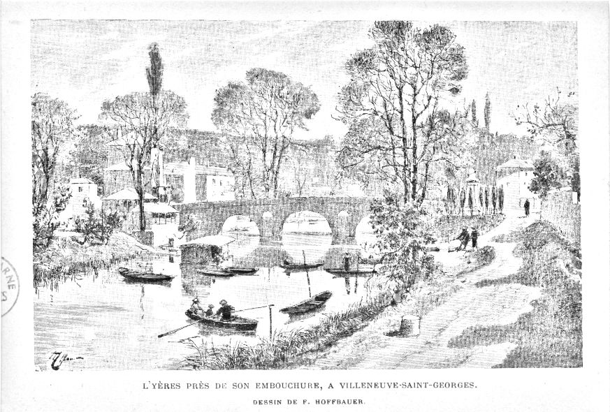 L'Yères près de son embouchure à Villeneuve-Saint-Georges. Dessin de F. Hoffbauer. Archives départementales du Val-de-Marne, 6FIA Villeneuve-Saint-Georges 1.