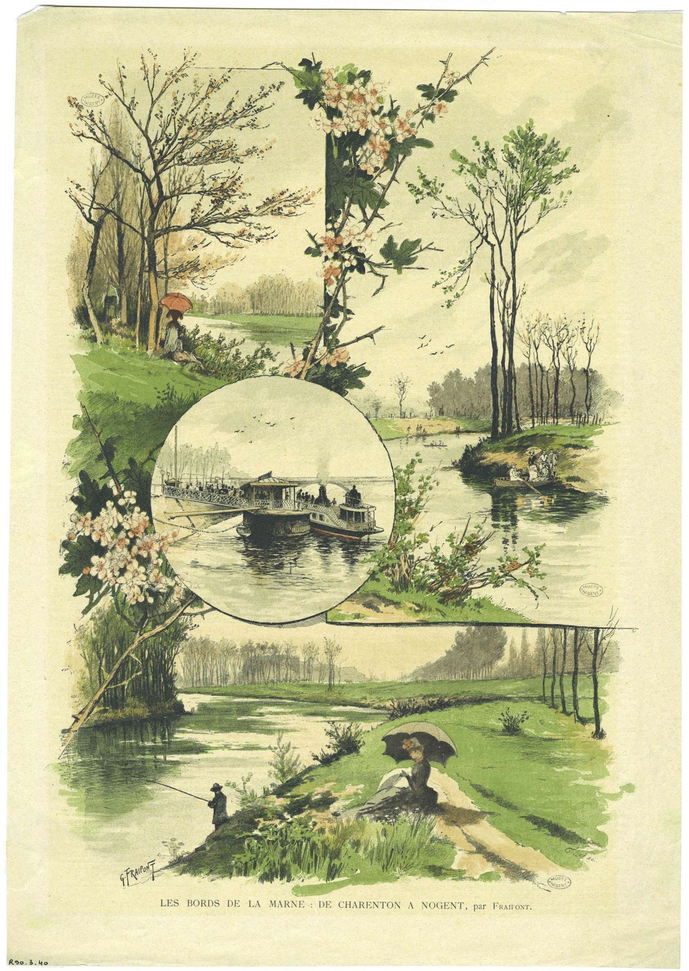Les bords de Marne de Charenton à Nogent, fin du XIXe siècle. Lithographie. 37 x 26 cm. Musée de Nogent-sur-Marne, R90 3 40