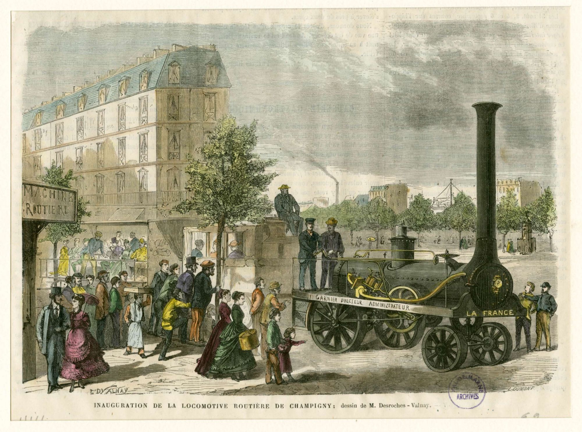 Inauguration de la locomotive routière de Champigny. Jacques Desroches-Valnay. 1869