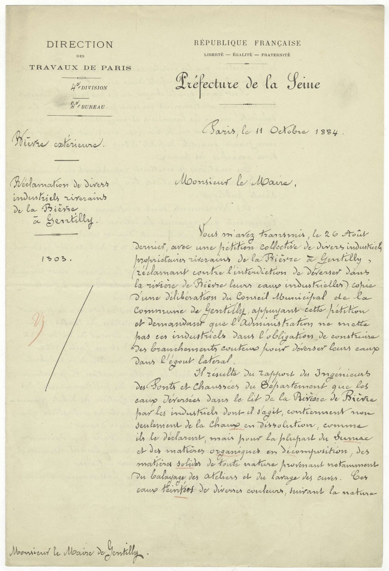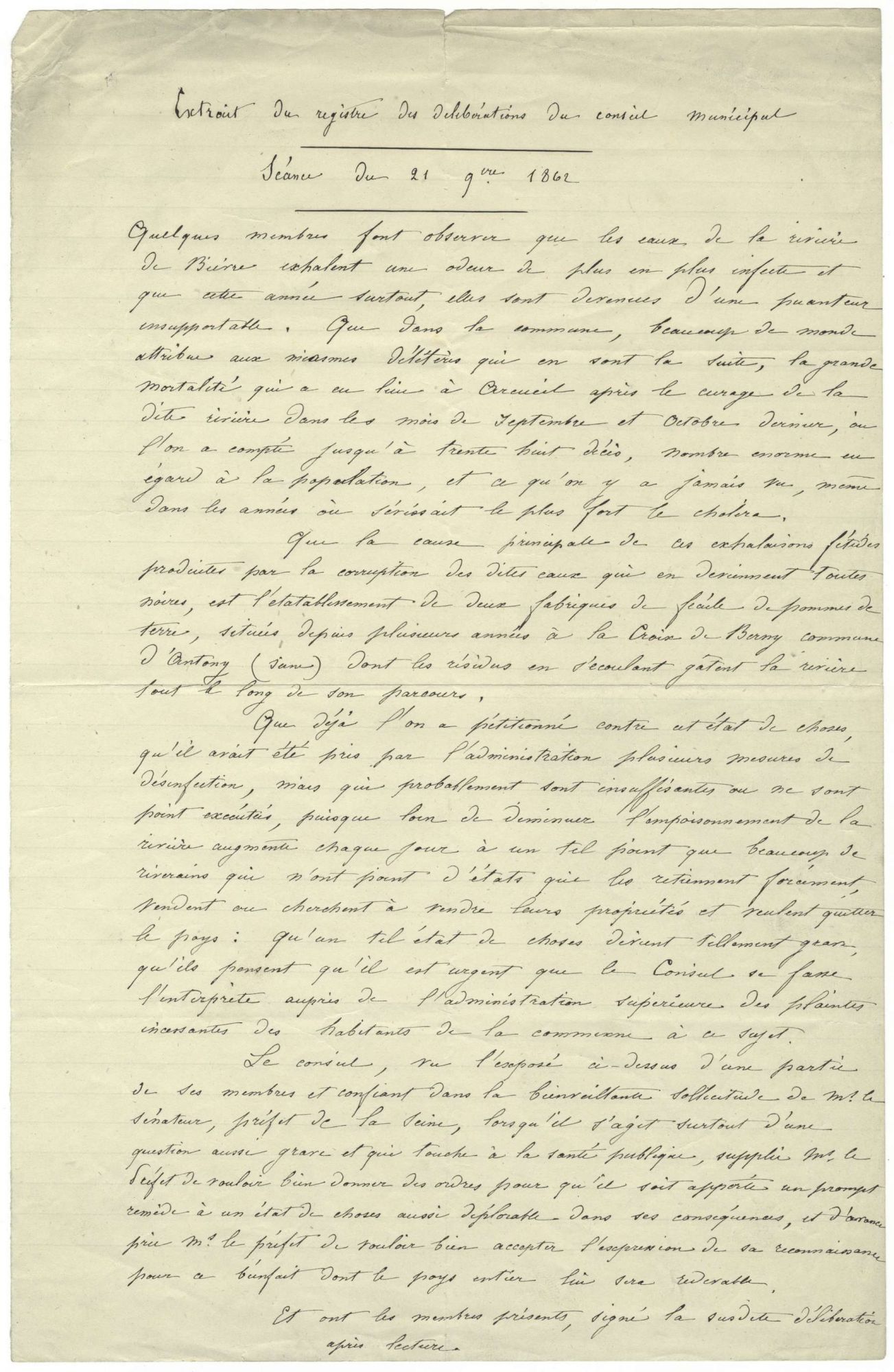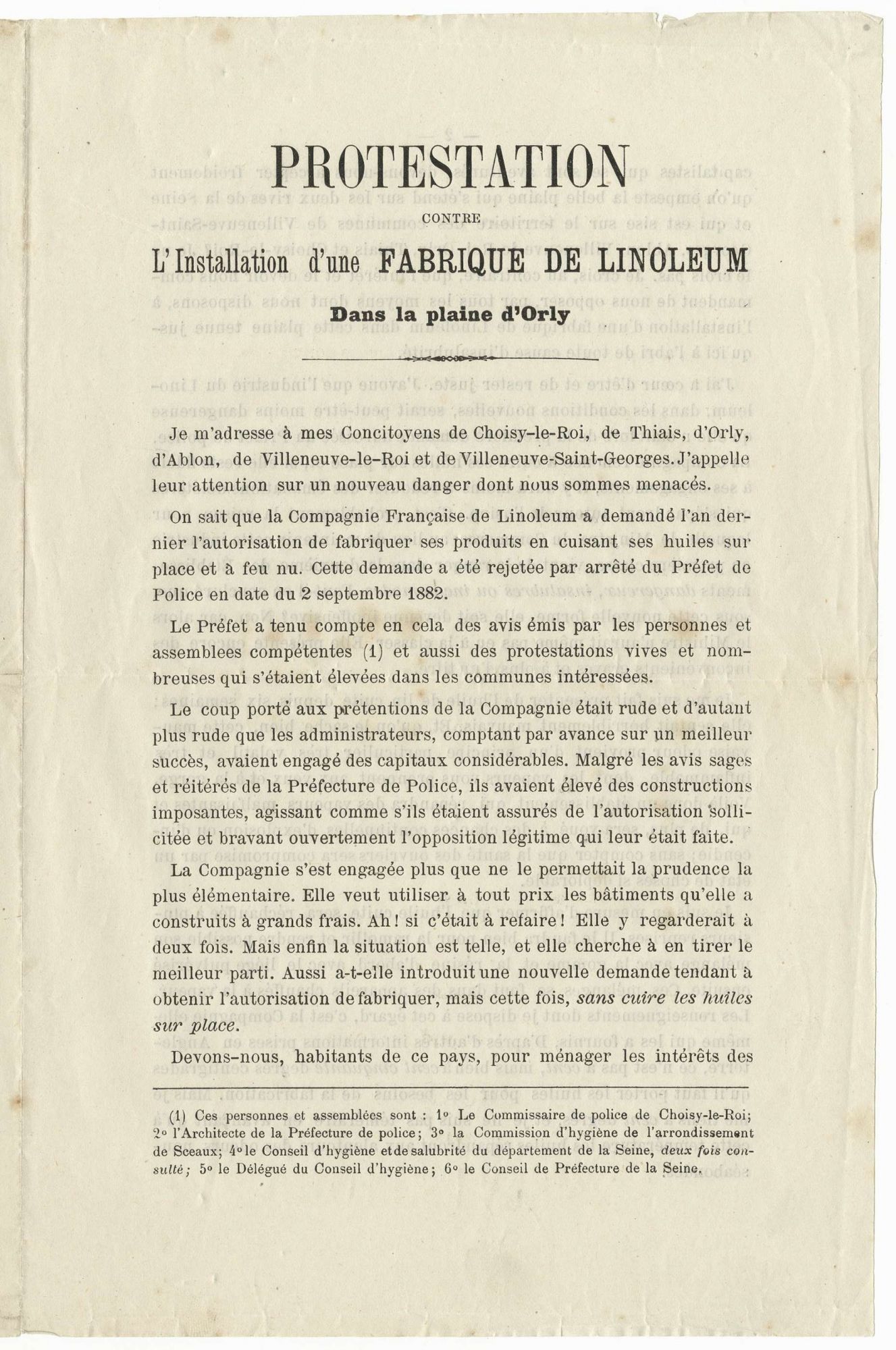 Découvrez, mise en voix, l'extrait d'un discours du conseil municipal Jules Groslous contre l'installation d'une fabrique de linoléum à Orly le 11 février 1883. (Archives départementales du Val-de-Marne, E dépôt Orly 5I 1)