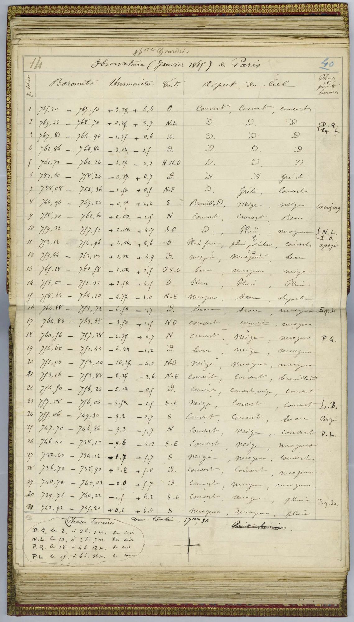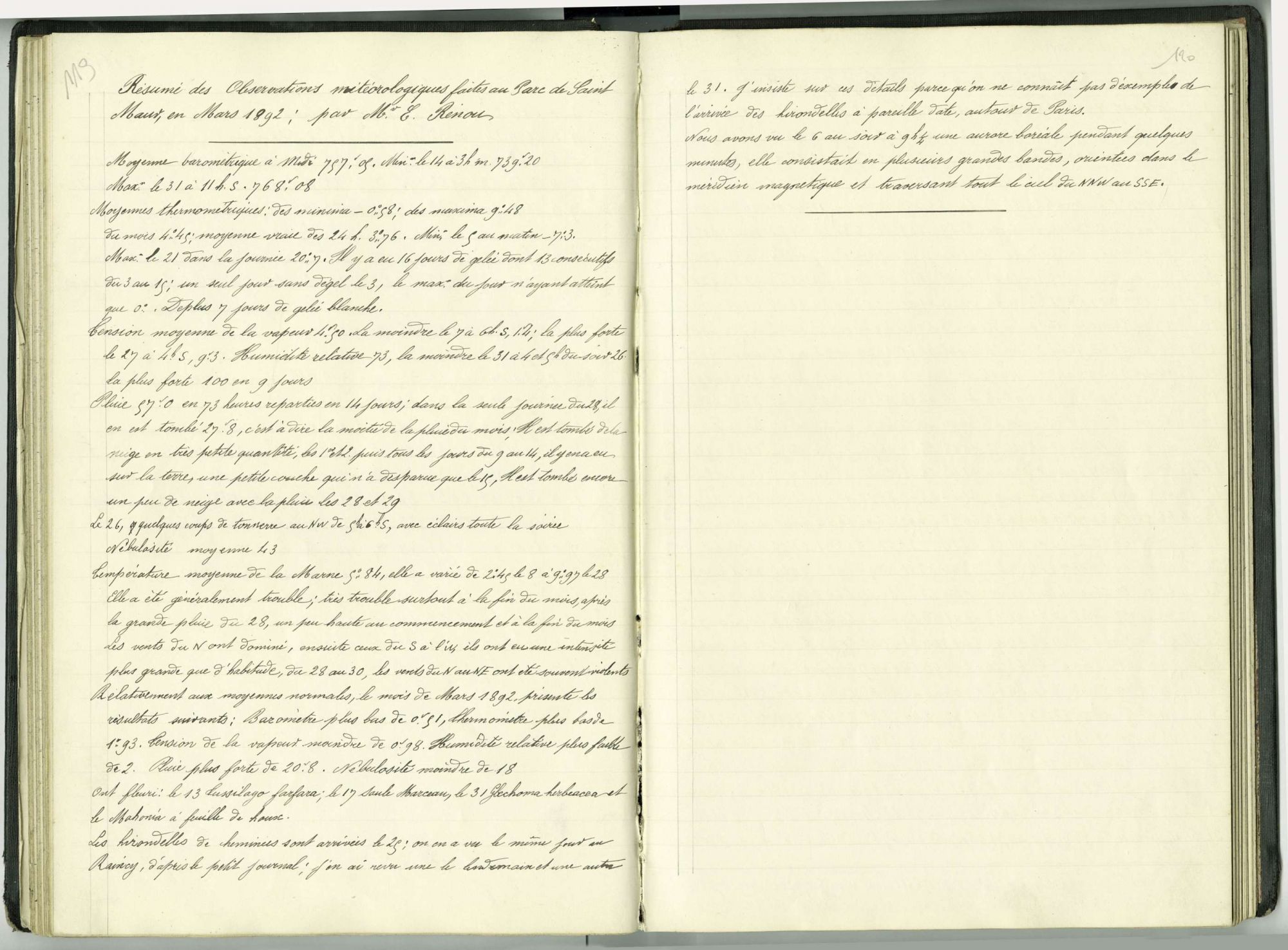 Dans le registre d’observations météorologiques de l’observatoire de Saint-Maur de 1892, le météorologue français Emilien Jean Renou (1815-1902) consigne des mesures instrumentales de température, pression atmosphérique, vitesse de déplacement des nuages, ainsi que des données phénologiques*. Ces mesures ont contribué à étayer son étude sur le climat de la région parisienne, à l’occasion de laquelle il a mis en évidence le phénomène d’îlot de chaleur. Celui-ci se caractérise par une élévation localisée des températures diurnes et nocturnes touchant le milieu urbain par rapport aux zones rurales et forestières voisines ou aux moyennes régionales.