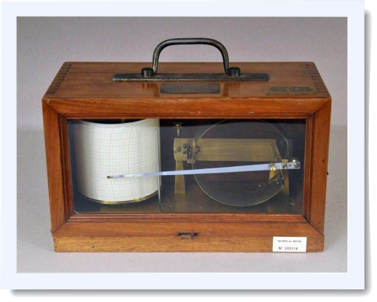 Un barographe est un baromètre enregistreur traçant la courbe des pressions atmosphériques. Lorsque la pression augmente, le tube dont il est constitué s'enroule, lorsqu'elle diminue il se déroule, ces variations sont matérialisées par le tracé d'une plume à l'encre sur une feuille fixée au tube. Le modèle de barographe présenté date de 1882, il n'a été fabriqué qu'à quelques exemplaires.