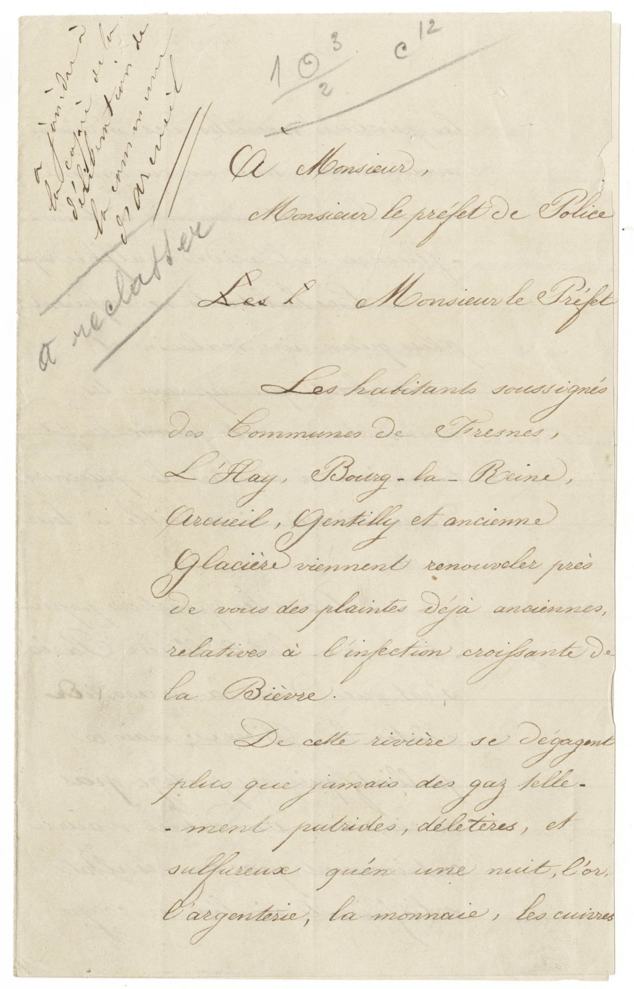 Egout à ciel ouvert bordé d’ateliers et industries polluantes, la Bièvre est canalisée, déviée puis enterrée aux XIX-XXe siècles. Un petit siècle s’écoule entre le portrait qu’en trace Victor Hugo en 1831 « ruisseau de moire et de soie » aux « eaux poissonneuses » et la déploration de Joris-Karl Huysmans en 1890 « la Bièvre coule, scarifiée par les acides. Globulée de crachats, épaissie de craie, délayée de suie, elle roule […] d’indescriptibles résidus qui la glacent, ainsi qu’un plomb qui bout, de pellicules ». Dans cet intervalle se lit l’histoire d’un désastre écologique.