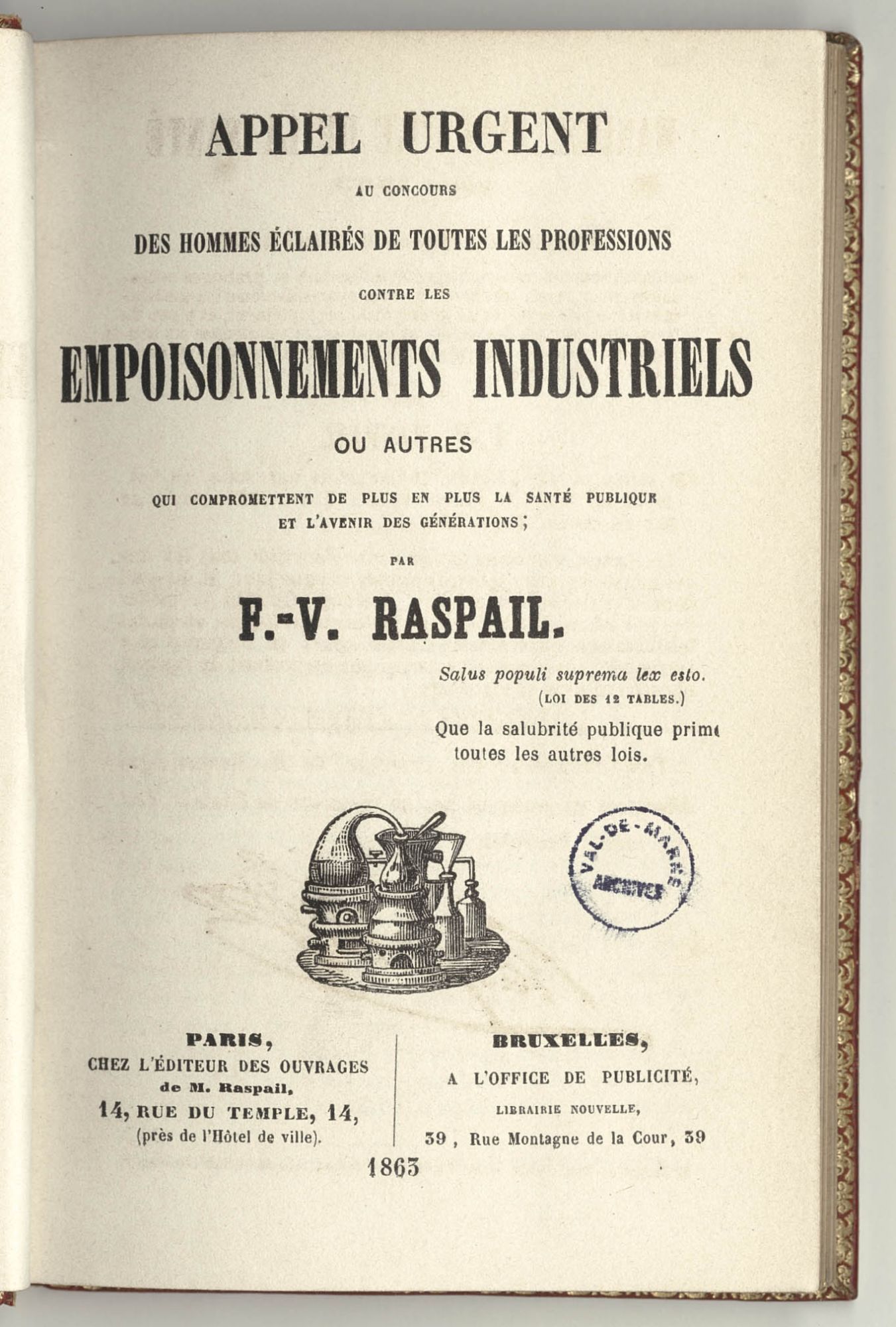 Dans cet essai le médecin François- Vincent Raspail décrit sous la forme d’un récit littéraire et philosophique les maux dont souffre un de ses patients qui absorbait quotidiennement un comprimé de camphre (utilisé pour combattre le choléra) raffiné dans une usine fabriquant également du sublimé corrosif* et des sels arsenicaux. Il analyse les causes de la détérioration de son état de santé : un empoisonnement dont la responsabilité revient à l’industrie fabriquant substances nocives ainsi que produits alimentaires et médicinaux dans les mêmes locaux, annihilant et pervertissant leurs vertus nutritives et prophylactiques. Au-delà de cette analyse, il livre une plaidoirie contre un système encourageant et protégeant les industriels au détriment parfois de la santé publique.