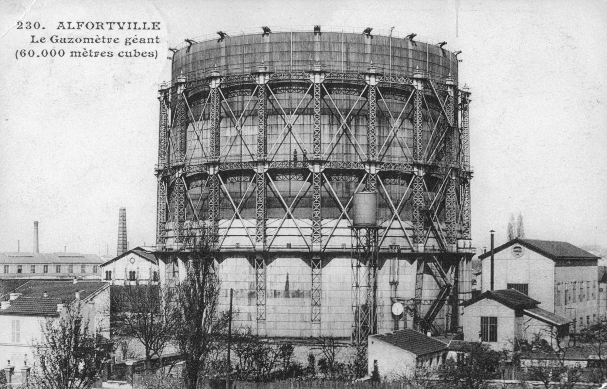 « Pareil à [une] colonne monstrueuse » (Maupassant), un gazomètre est un réservoir destiné à emmagasiner du gaz de ville (gaz manufacturé) pour éclairer et chauffer les grands centres urbains avant l’avènement de l’électricité. Datant de la chimie moderne, ce gaz émane des découvertes d’Antoine Lavoisier. Il procède d’une tentative de recyclage des rebus de l’industrie charbonnière puisqu’il est issu de la pyrolyse de la houille (décomposition du charbon, composant organique, par une augmentation de sa température).