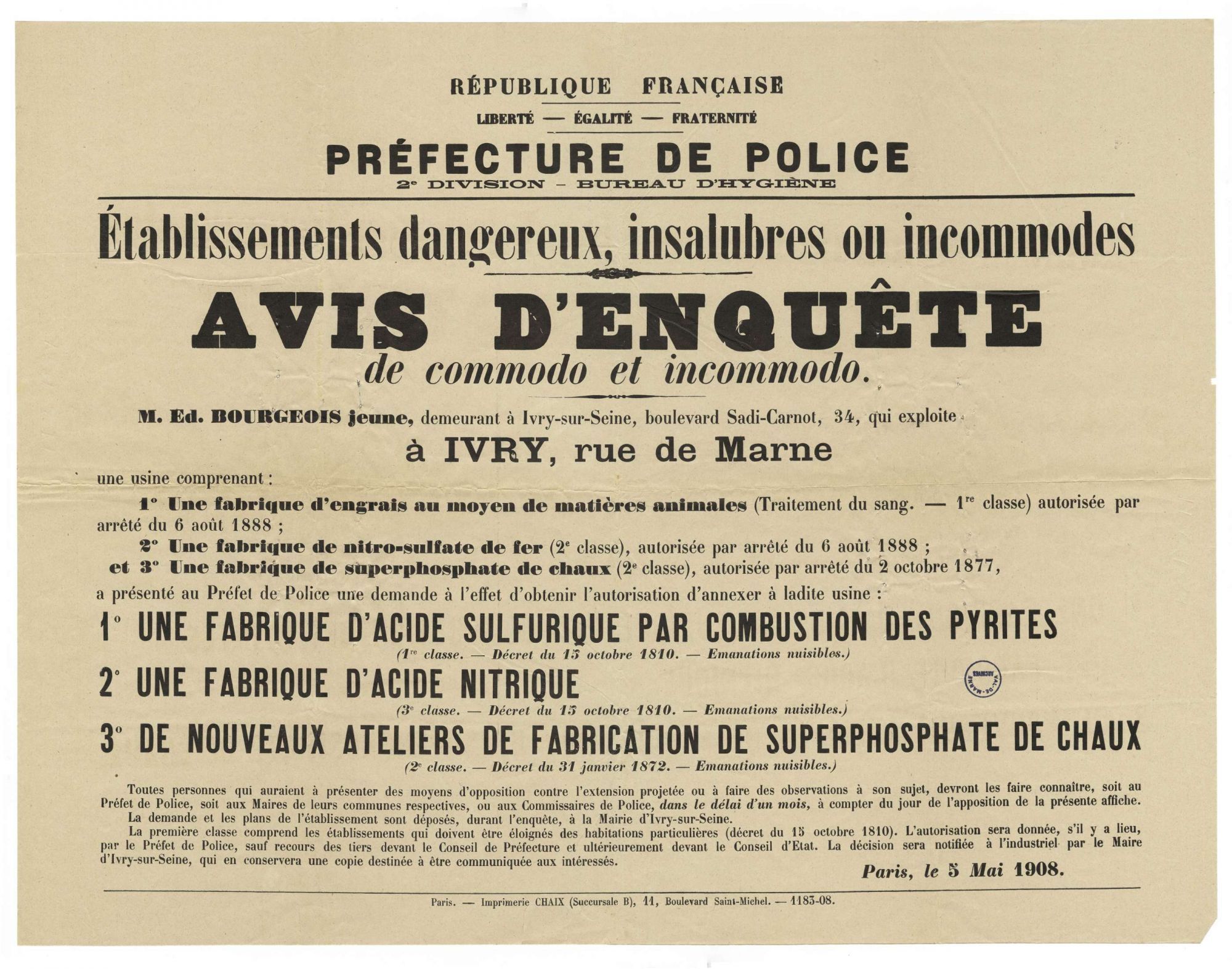 L’avis d’enquête porte sur un établissement fabriquant des supersphosphates, premier engrais minéral à avoir été synthétisé. Il est obtenu par l’attaque chimique d’une roche phosphatée par de l’acide sulfurique. L’utilisation excessive de ce produit dans l’agriculture, notamment son usage préventif ou en combinaison des engrais azotés, peut entraîner une eutrophisation* des rivières.
