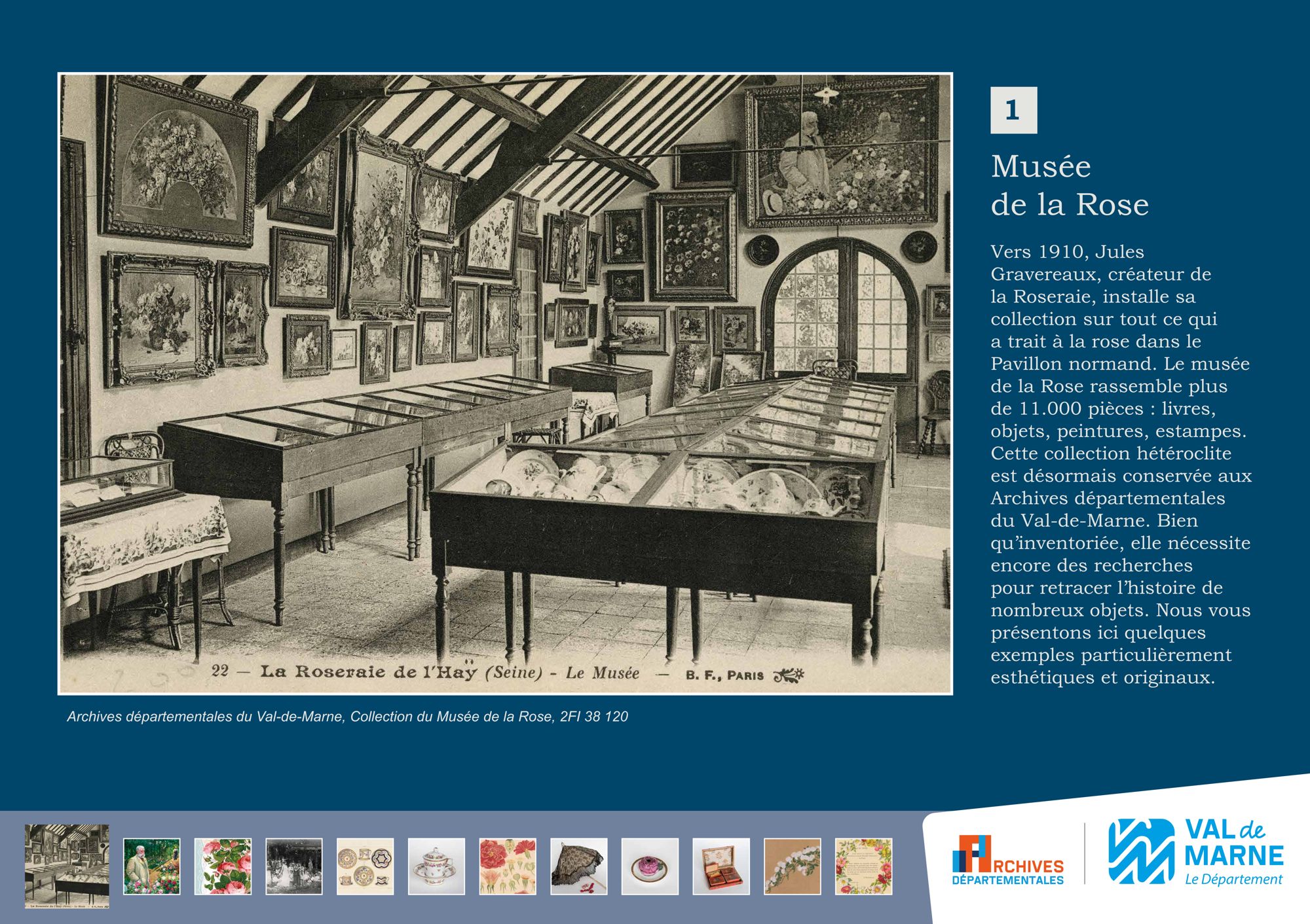 Le musée de la Rose créé par Jules Gravereaux rassemblait plus de 11.000 pièces : livres, objets, peintures, estampes. Cette collection hétéroclite installée vers 1910 dans le Pavillon normand de la Roseraie est désormais conservée aux Archives départementales du Val-de-Marne après la fermeture du musée. Bien qu’inventoriée, elle nécessite encore des recherches pour retracer l’histoire de nombreux objets.