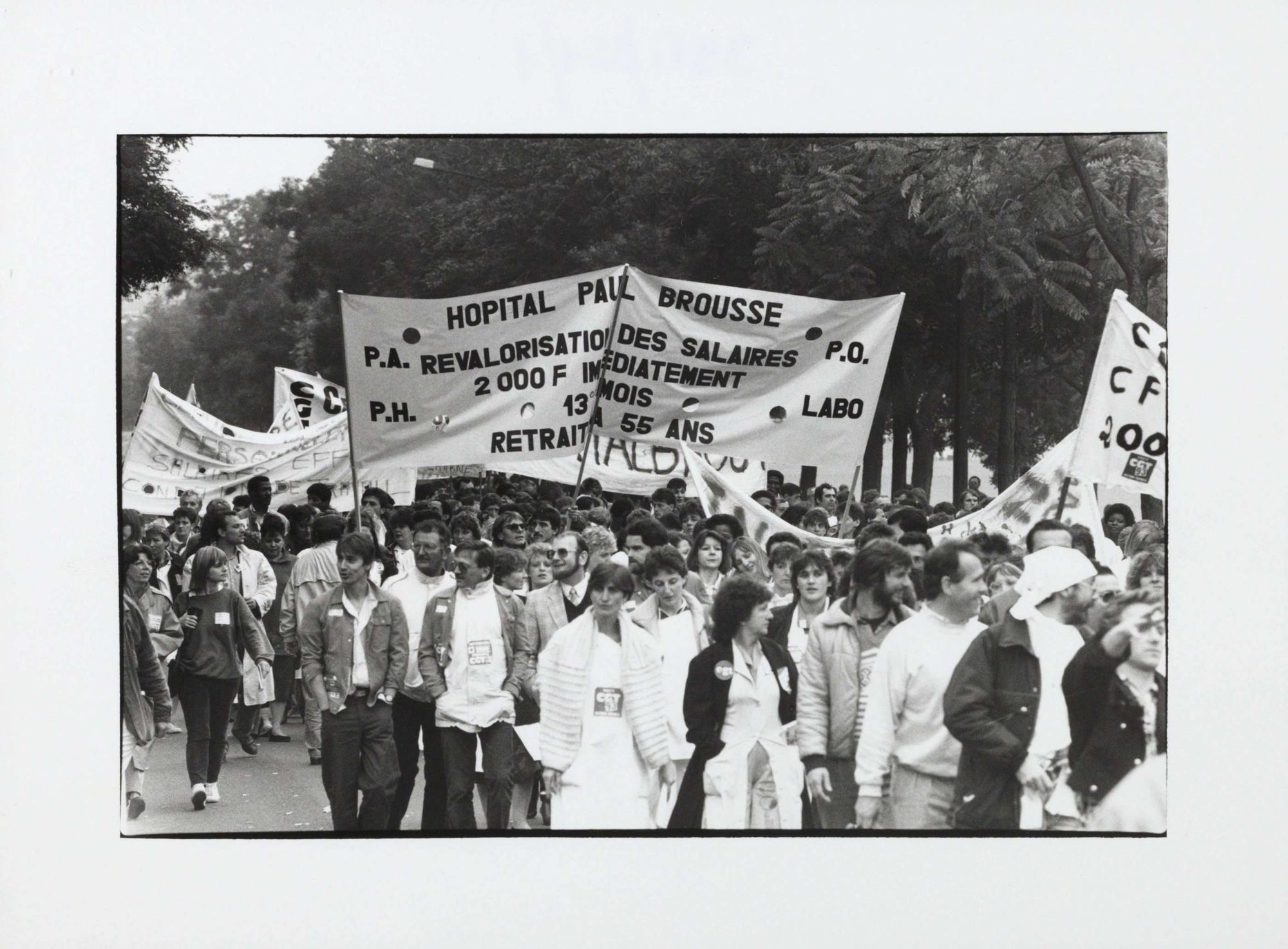 Vues des infirmiers et infirmières manifestant dans les rues (2). Vue de la salle d'accueil de l'hôpital Paul-Brousse (1). Infirmière marchant dans un couloir de l'hôpital (1). Portraits d'infirmières (6). Vues des infirmiers et infirmières en grève lors d'une réunion (8).