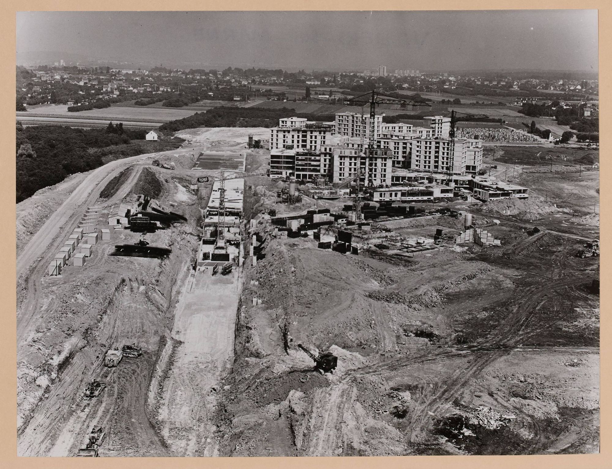 Ensemble HLM des Hautes-Noues (architecte Denis Honegger) : vues aériennes obliques des immeubles en construction.